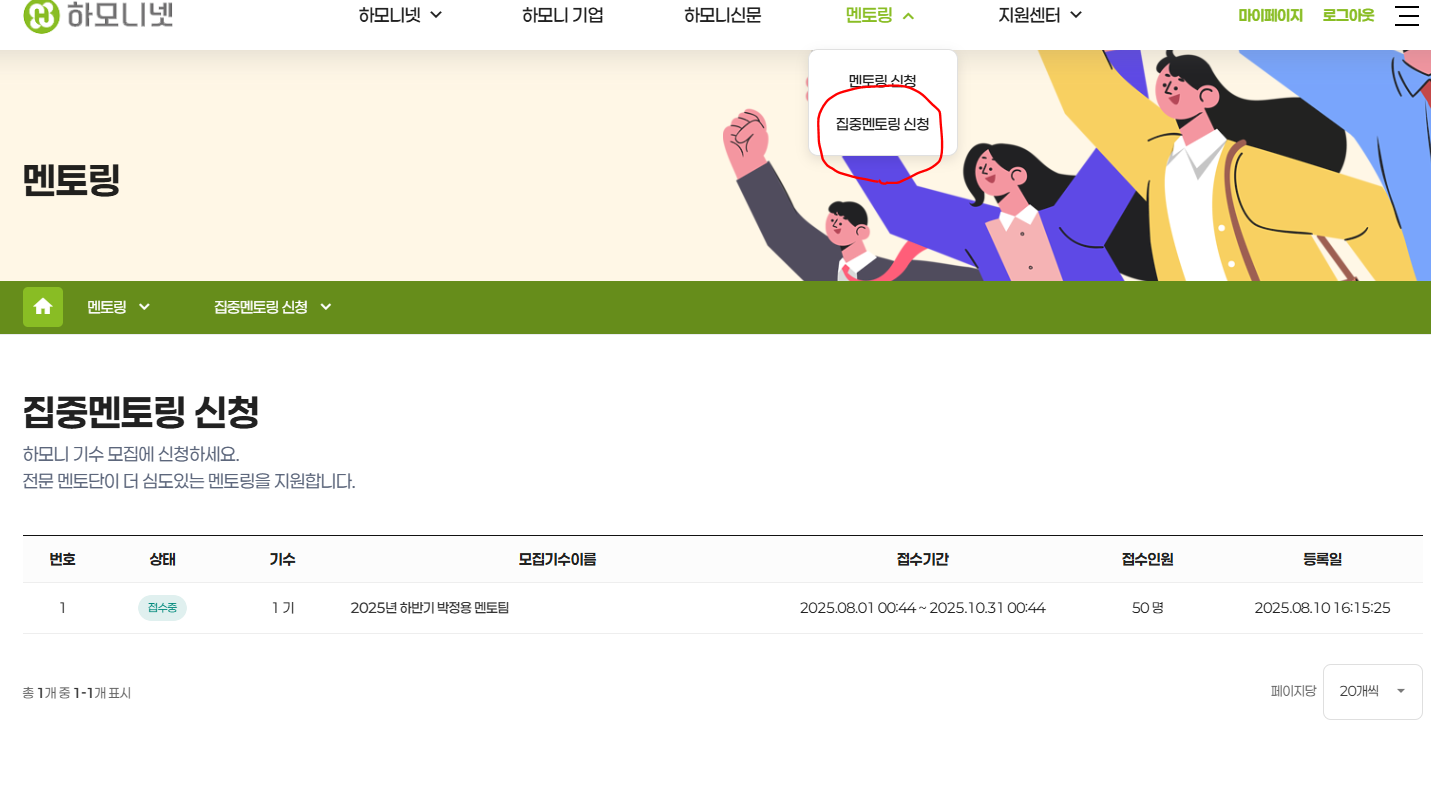 하모니넷 멘토링 중 집중멘토링은 멘토와 멘토링팀으로 사전 결성된 기수(팀) 멘토링입니다